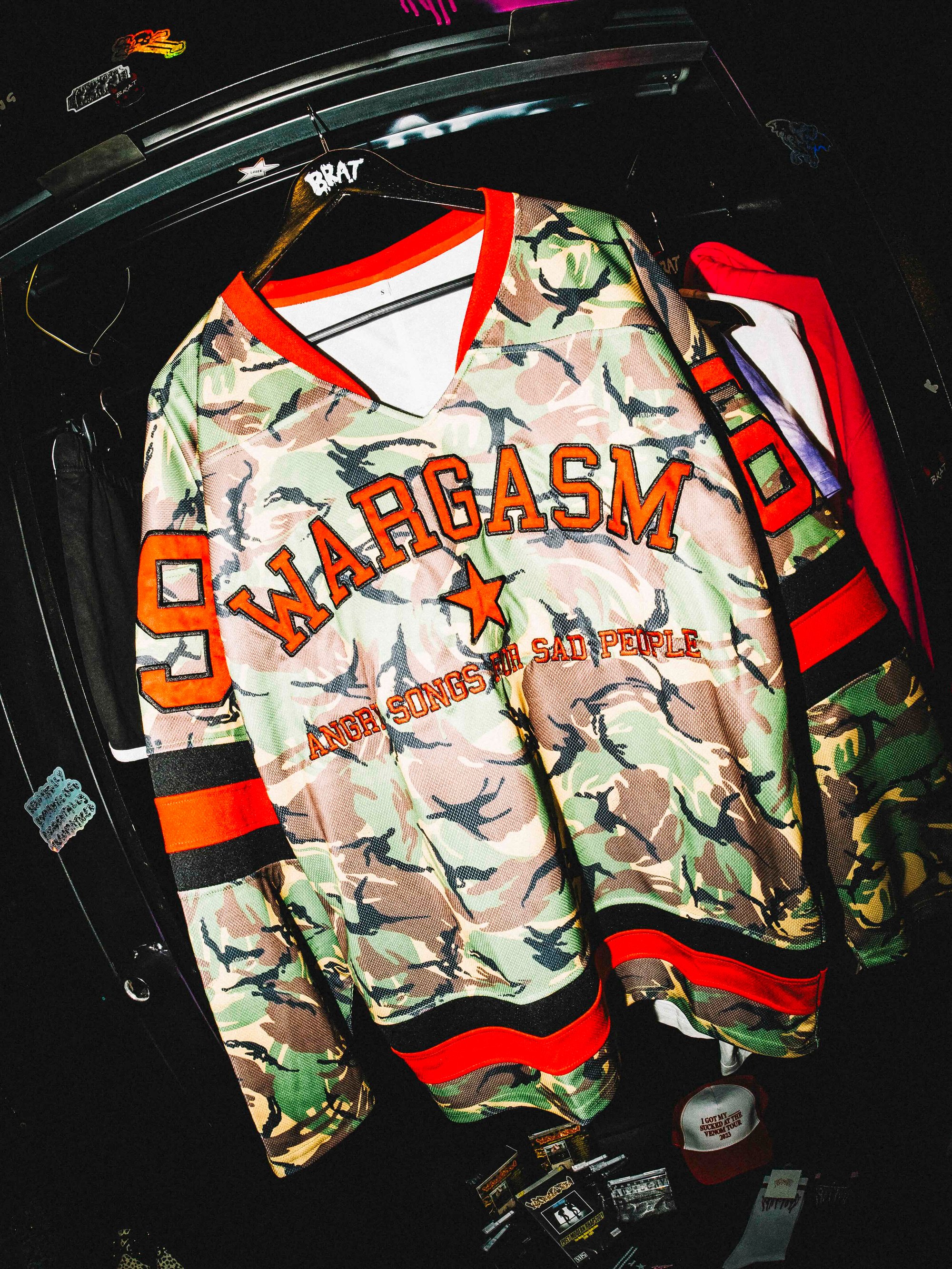 Oversized red and black embroidered WARGASM // FUKSTAR 69 camouflage jersey. Fucking awesome. Now they see now they don't.